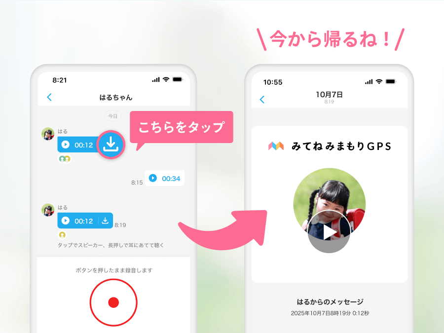 「みてねみまもりGPSトーク」は、端末とスマホの双方向でボイスメッセージでのやり取りができます。「みてねみまもりGPお知らせボタン搭載モデル」は、端末から発信を行えるお知らせボタンが搭載されています。