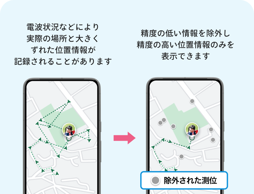 測位が不安定な環境でも、信頼性の高い位置情報だけを表示する調整が可能です。